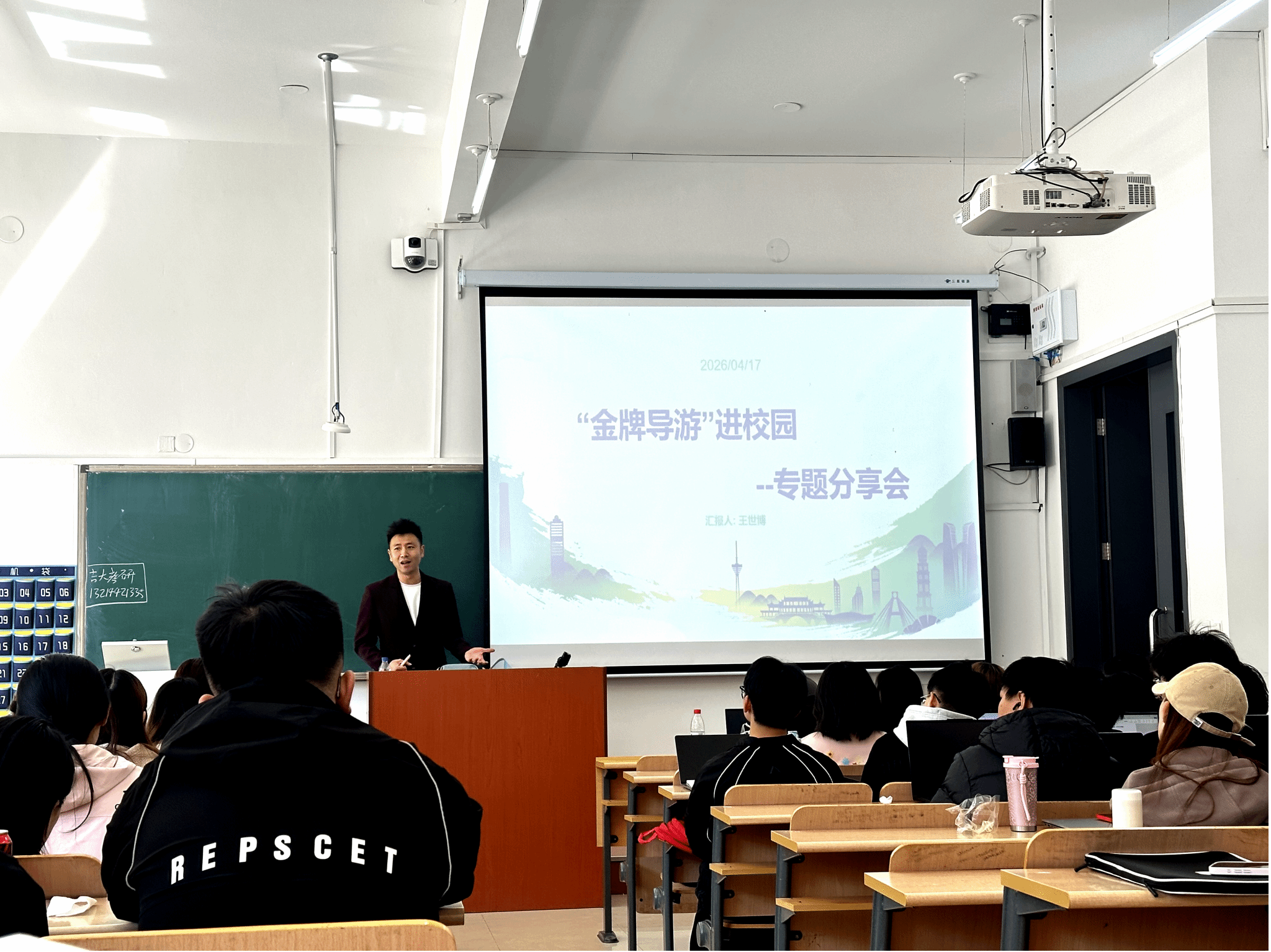 4月22日,作为长春旅游协会与旅游文化传播学院“五个一”战略合作签约重点项目之一,“金牌导游进校园”主题活动在吉林工商学院旅游文化传播学院顺利举行。国家金牌导游、优秀校友王世博受邀返校,为旅游文化传播学院学子带来职业规划指导与行业实战分享,助力学生考证备考、对接企业就业,深化产教融合育人实效。